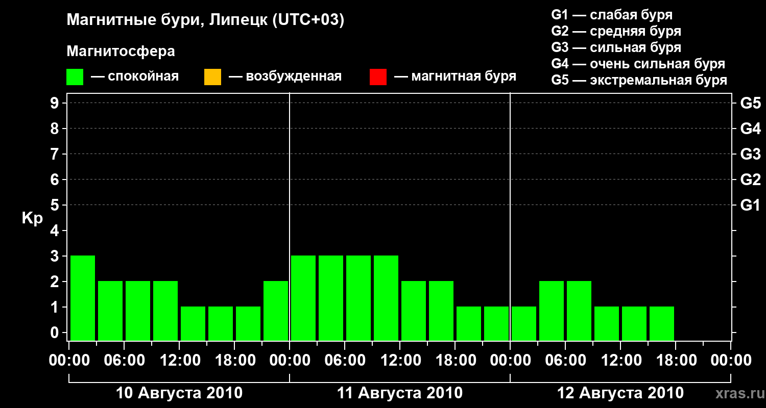 Изменения геомагнитного индекса Kp с 10 по 12 августа 2010 года для средних широт