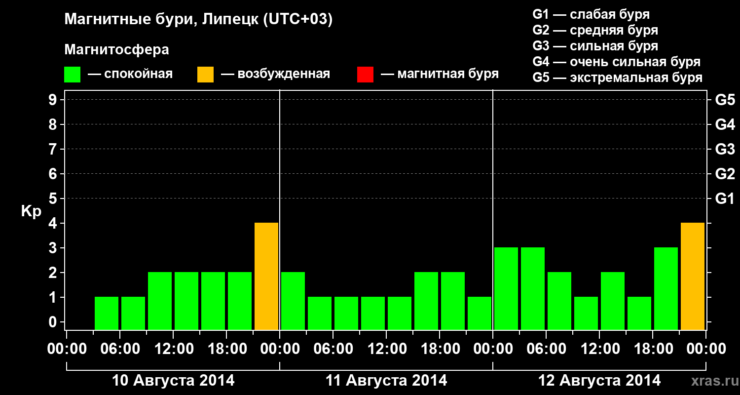 Изменения геомагнитного индекса Kp с 10 по 12 августа 2014 года для средних широт
