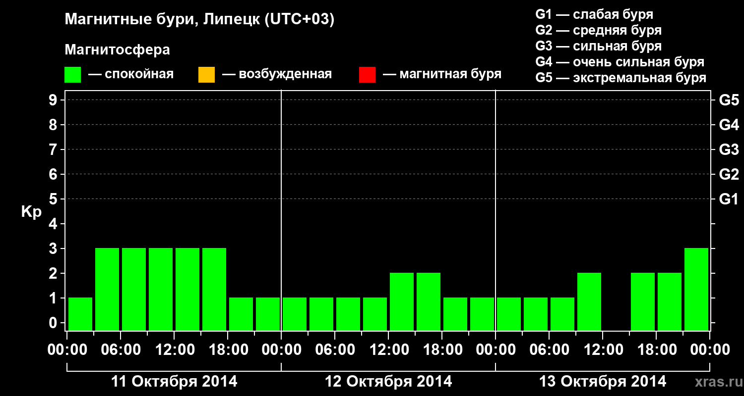 Изменения геомагнитного индекса Kp с 11 по 13 октября 2014 года для средних широт
