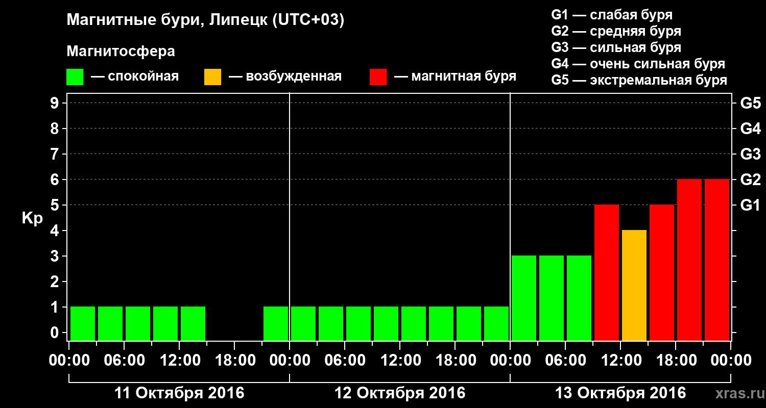Изменения геомагнитного индекса Kp с 11 по 13 октября 2016 года для средних широт