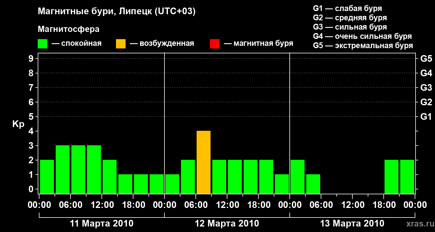 Изменения геомагнитного индекса Kp с 11 по 13 марта 2010 года для средних широт