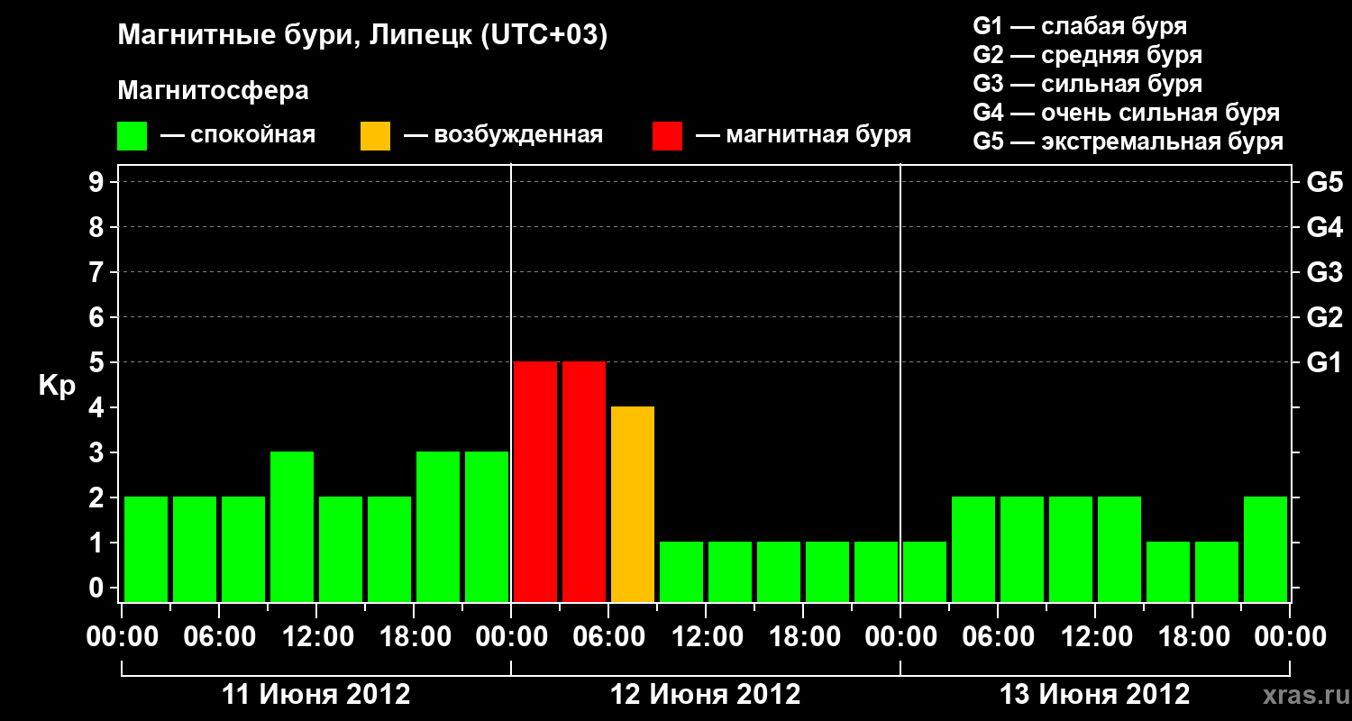 Изменения геомагнитного индекса Kp с 11 по 13 июня 2012 года для средних широт