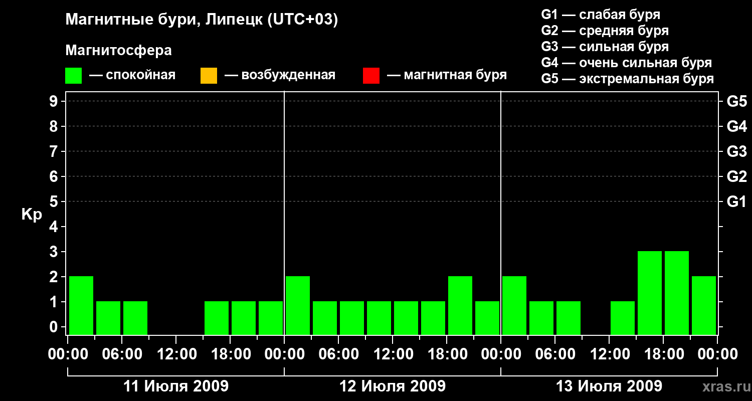Изменения геомагнитного индекса Kp с 11 по 13 июля 2009 года для средних широт