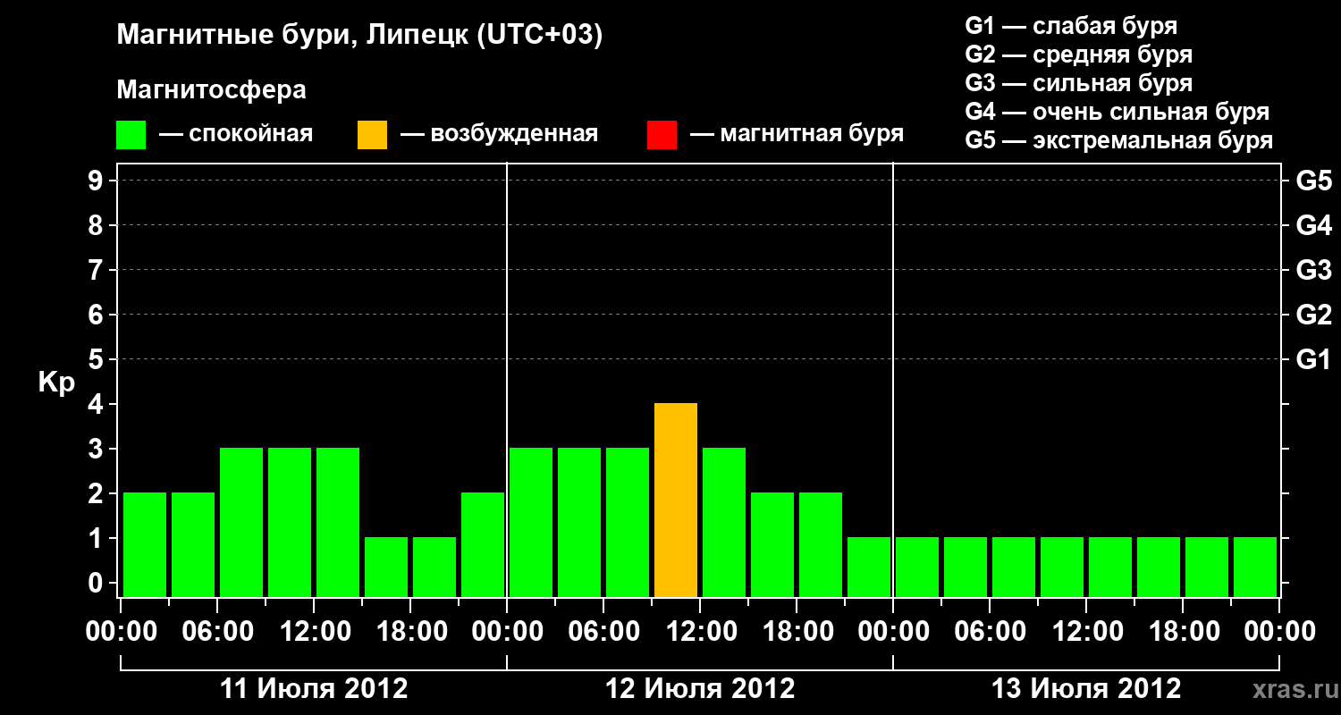 Изменения геомагнитного индекса Kp с 11 по 13 июля 2012 года для средних широт
