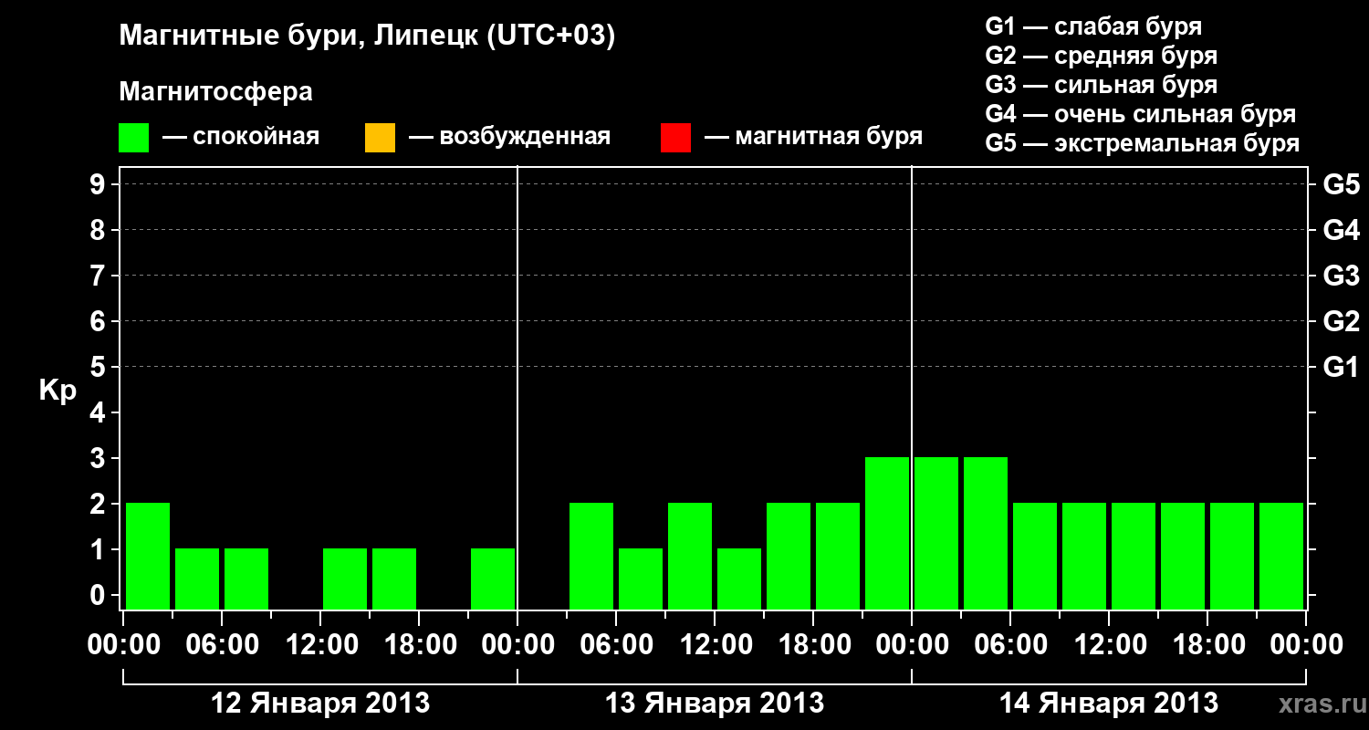 Изменения геомагнитного индекса Kp с 12 по 14 января 2013 года для средних широт