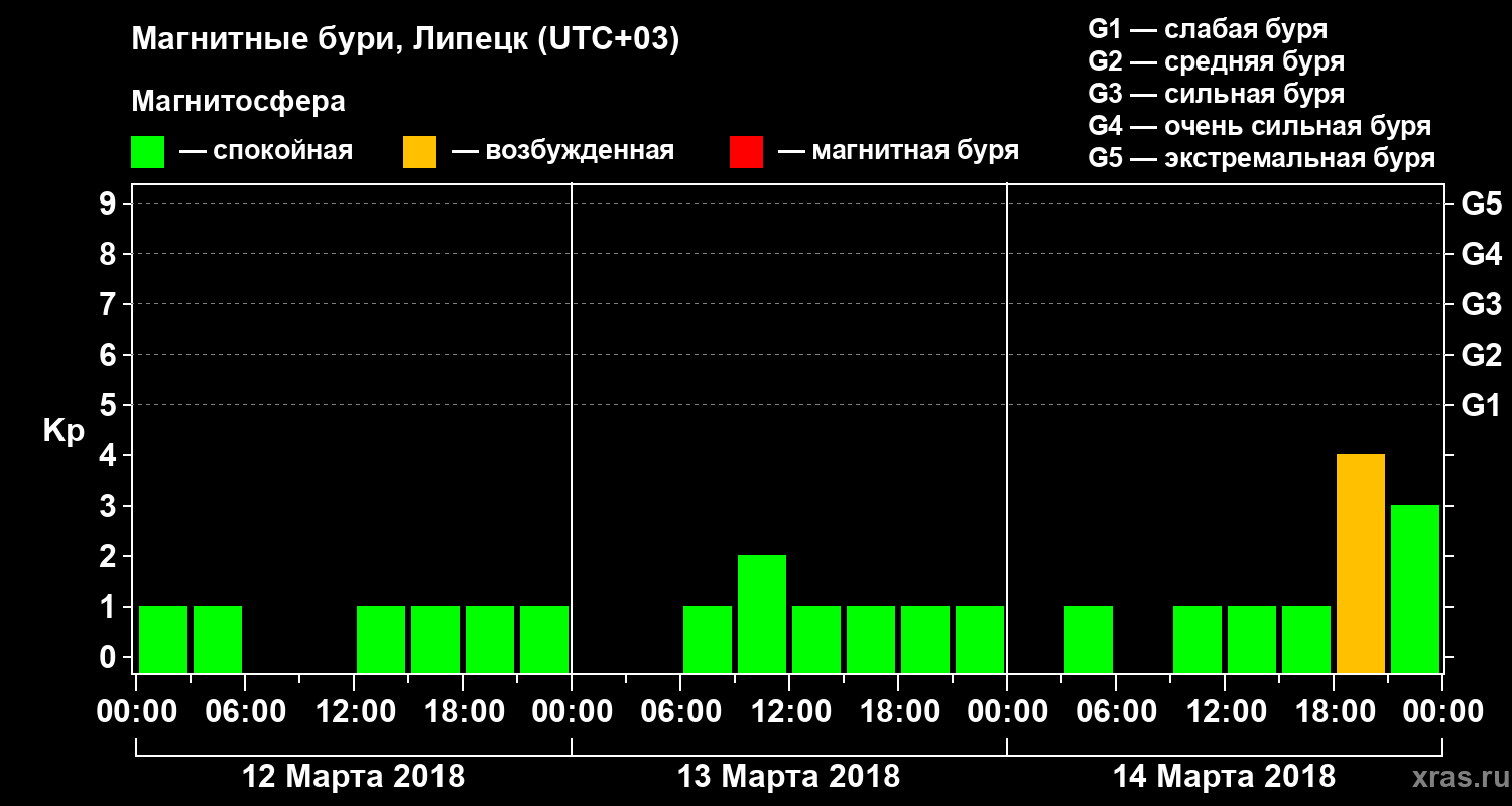 Изменения геомагнитного индекса Kp с 12 по 14 марта 2018 года для средних широт