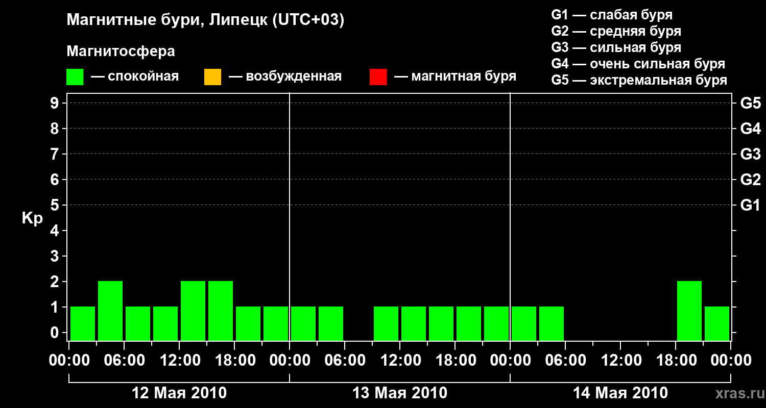 Изменения геомагнитного индекса Kp с 12 по 14 мая 2010 года для средних широт