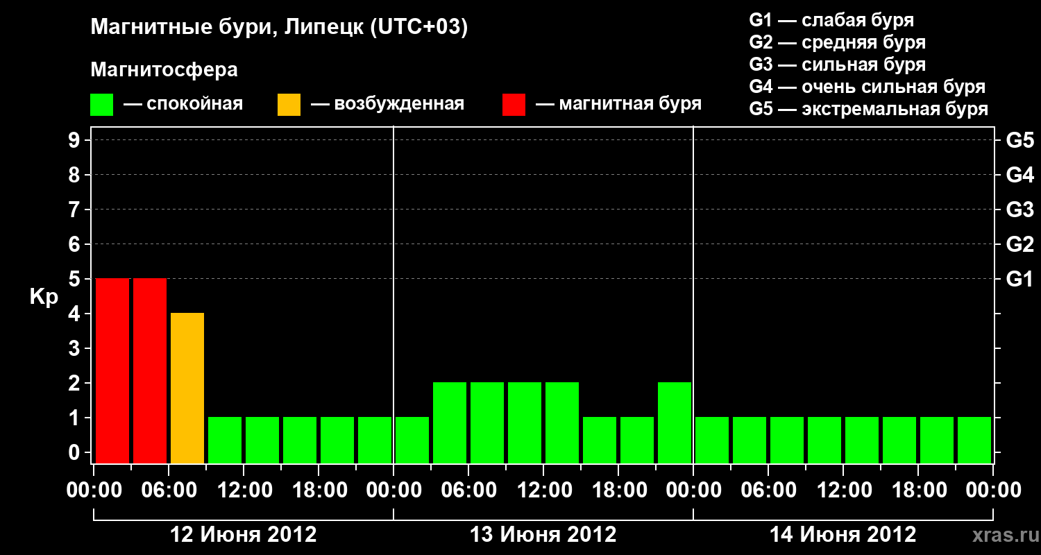 Изменения геомагнитного индекса Kp с 12 по 14 июня 2012 года для средних широт