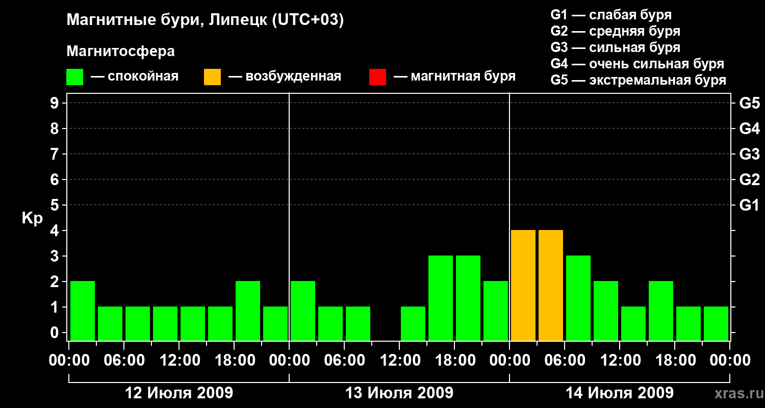 Изменения геомагнитного индекса Kp с 12 по 14 июля 2009 года для средних широт