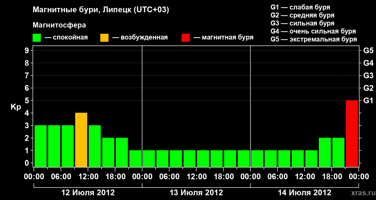 Изменения геомагнитного индекса Kp с 12 по 14 июля 2012 года для средних широт