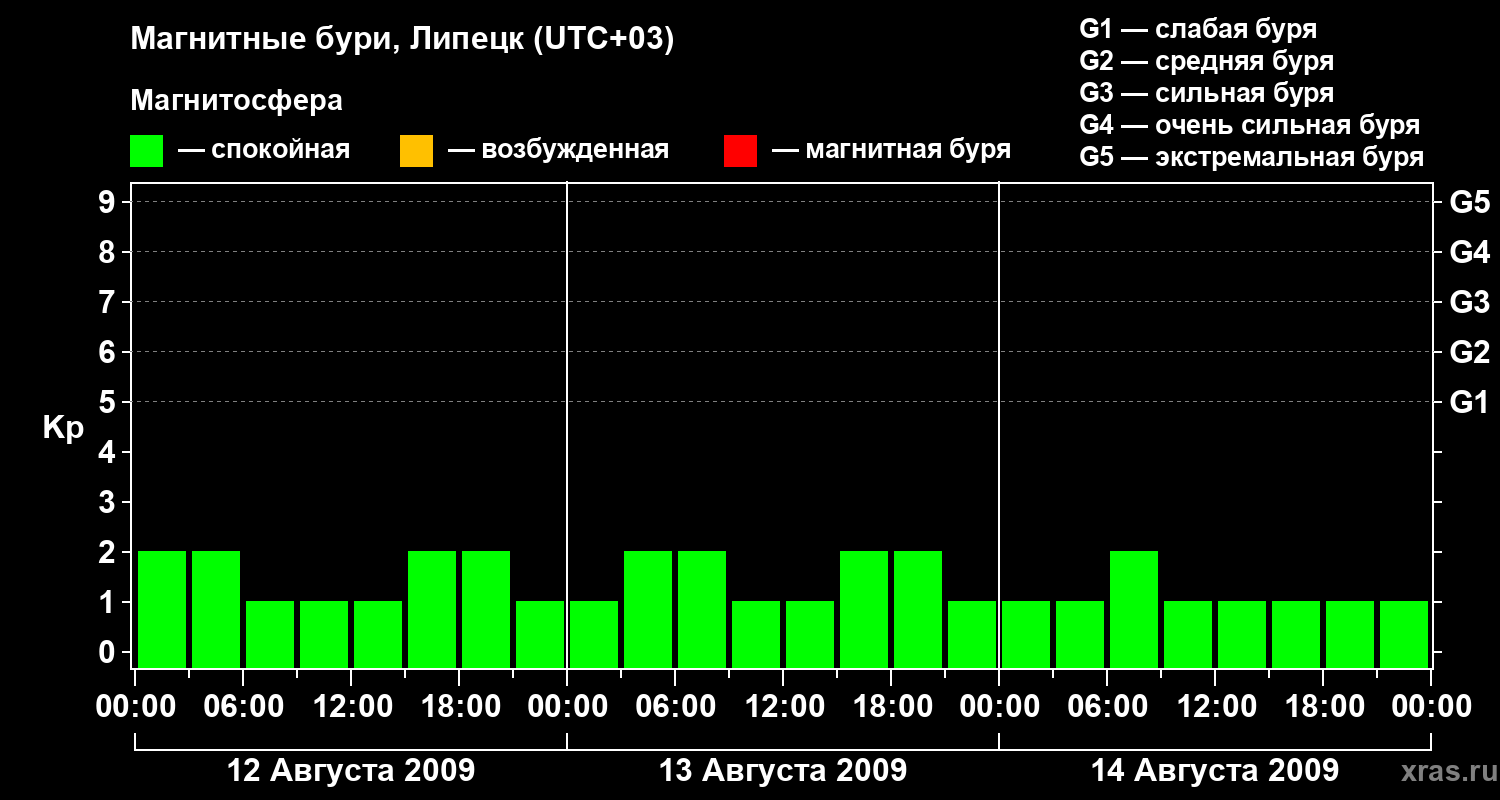 Изменения геомагнитного индекса Kp с 12 по 14 августа 2009 года для средних широт