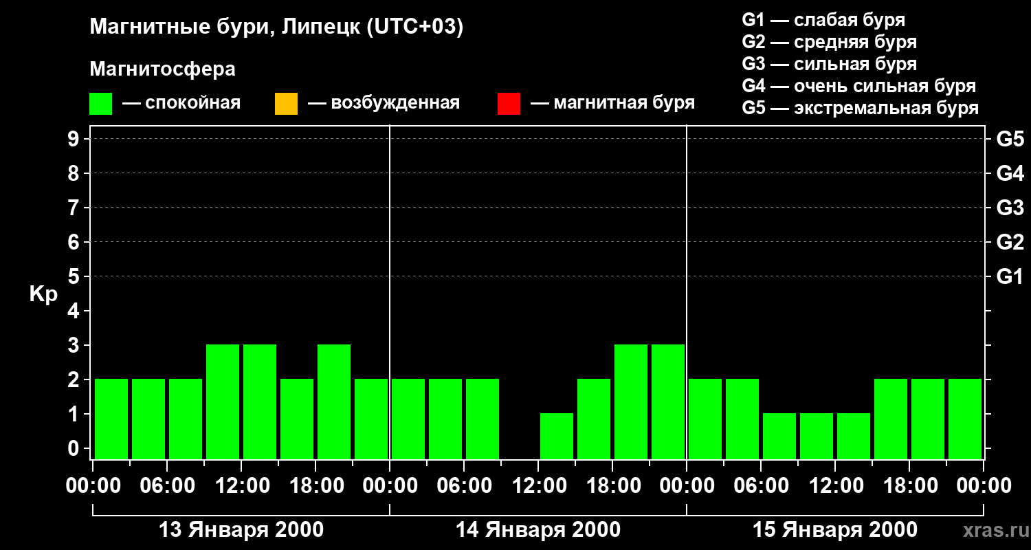 Изменения геомагнитного индекса Kp с 13 по 15 января 2000 года для средних широт