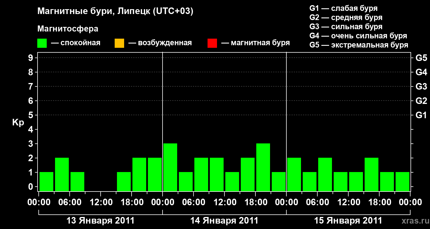 Изменения геомагнитного индекса Kp с 13 по 15 января 2011 года для средних широт