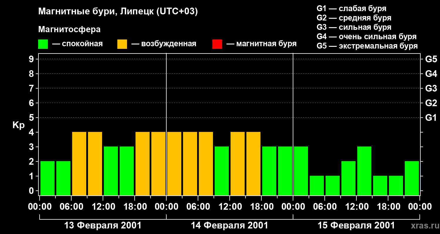 Изменения геомагнитного индекса Kp с 13 по 15 февраля 2001 года для средних широт