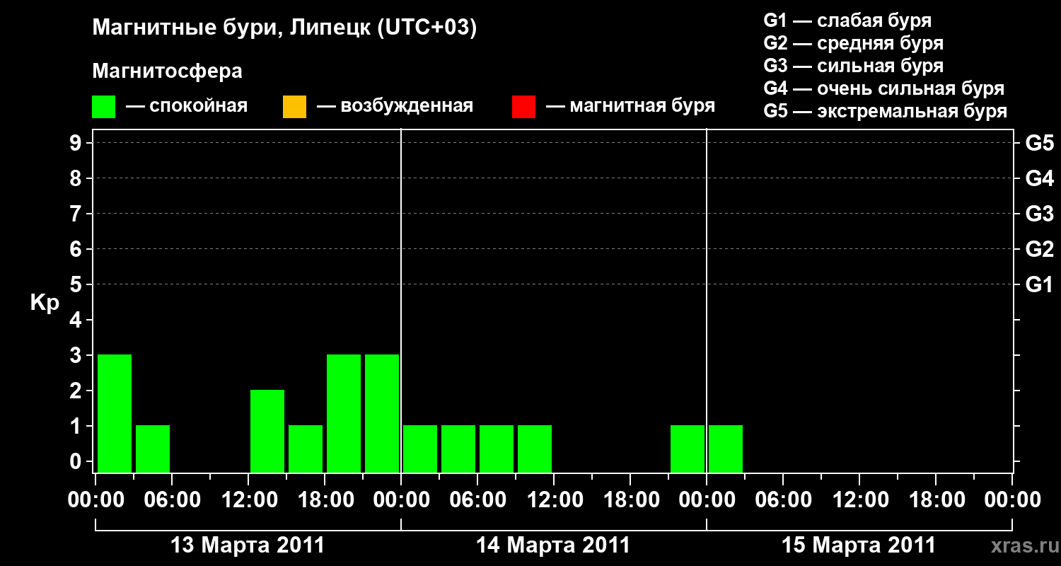 Изменения геомагнитного индекса Kp с 13 по 15 марта 2011 года для средних широт