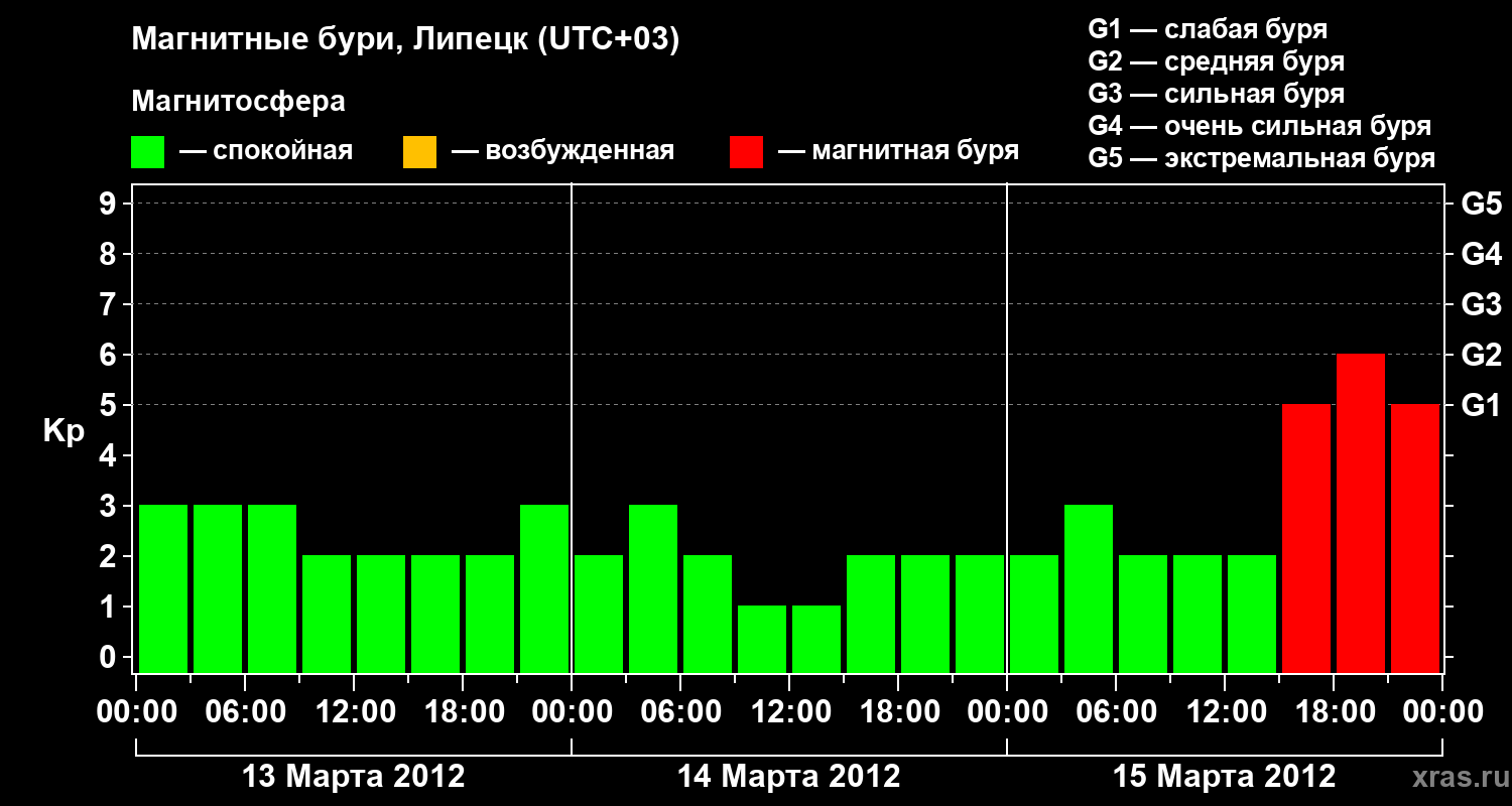 Изменения геомагнитного индекса Kp с 13 по 15 марта 2012 года для средних широт