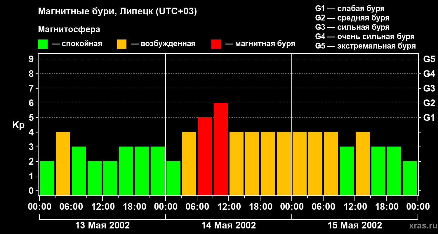 Изменения геомагнитного индекса Kp с 13 по 15 мая 2002 года для средних широт