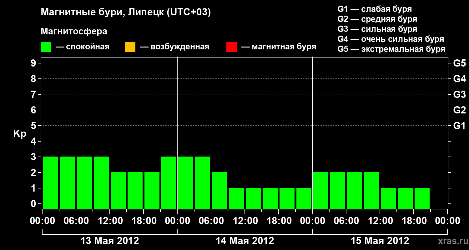 Изменения геомагнитного индекса Kp с 13 по 15 мая 2012 года для средних широт