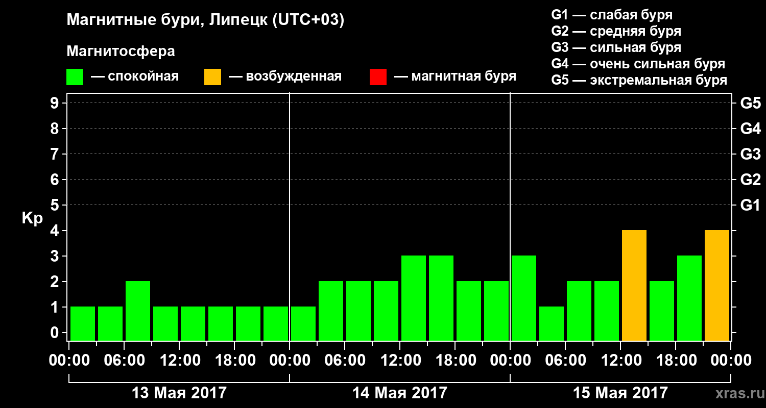 Изменения геомагнитного индекса Kp с 13 по 15 мая 2017 года для средних широт