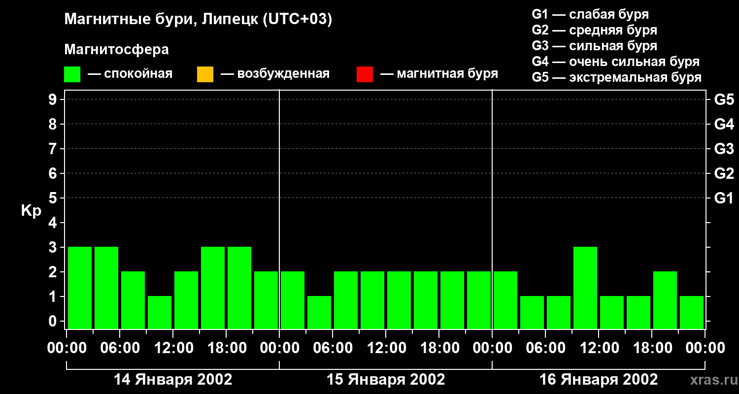Изменения геомагнитного индекса Kp с 14 по 16 января 2002 года для средних широт