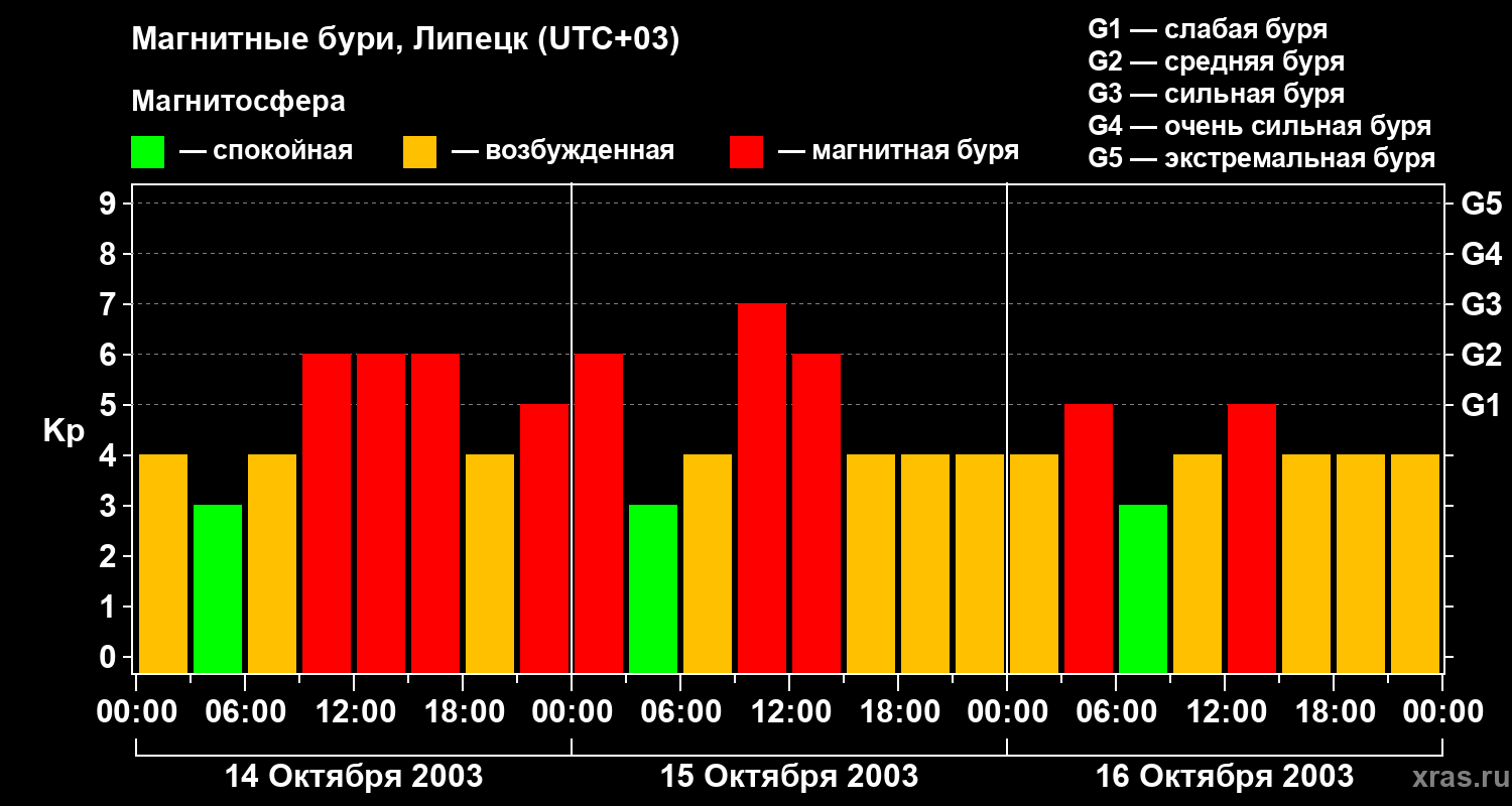 Изменения геомагнитного индекса Kp с 14 по 16 октября 2003 года для средних широт
