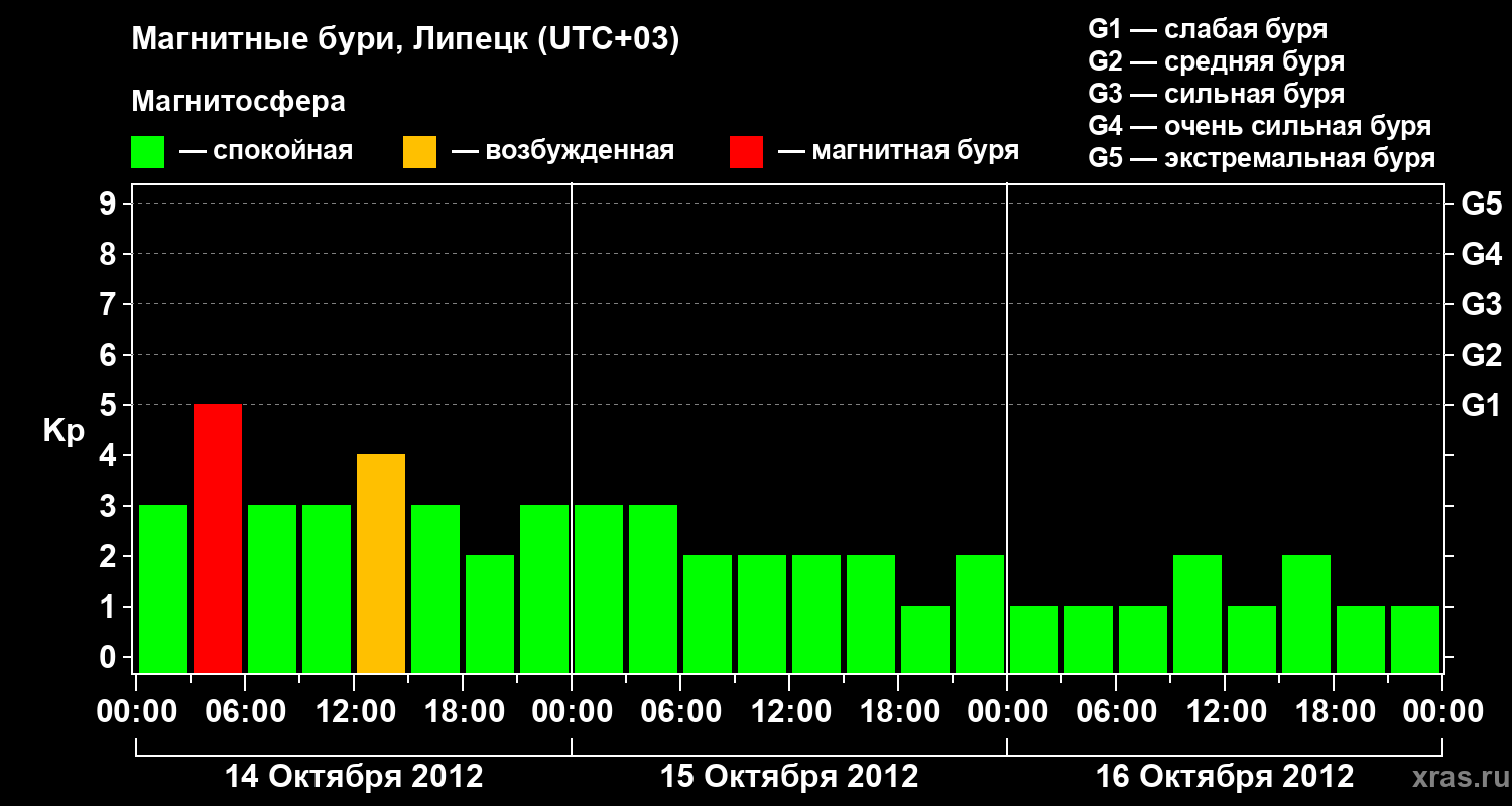Изменения геомагнитного индекса Kp с 14 по 16 октября 2012 года для средних широт