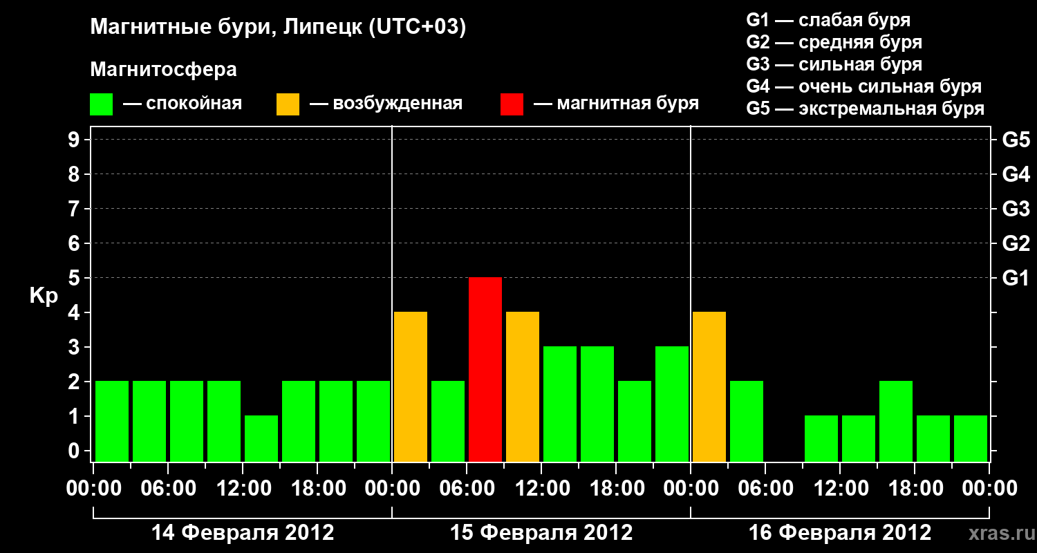 Изменения геомагнитного индекса Kp с 14 по 16 февраля 2012 года для средних широт