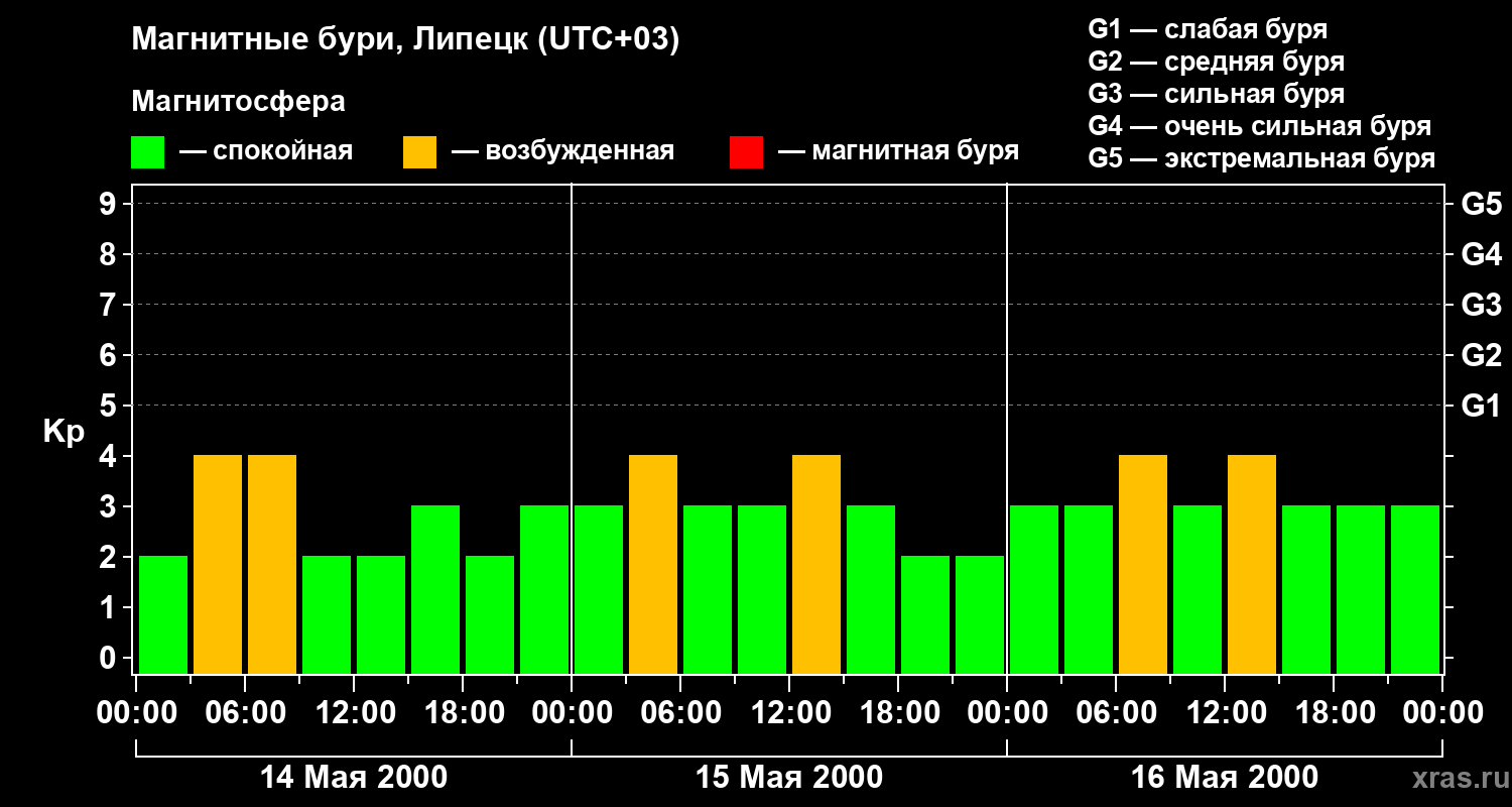 Изменения геомагнитного индекса Kp с 14 по 16 мая 2000 года для средних широт