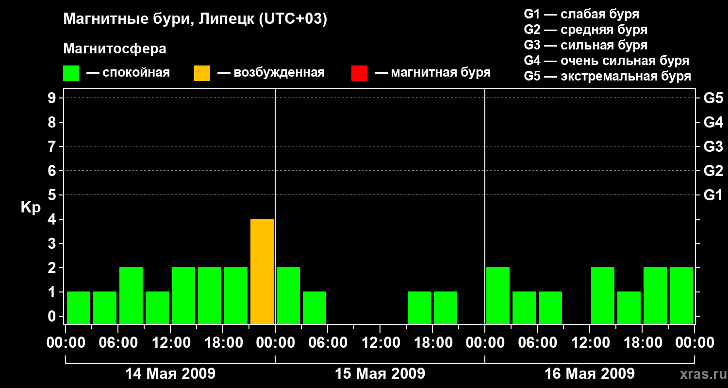 Изменения геомагнитного индекса Kp с 14 по 16 мая 2009 года для средних широт