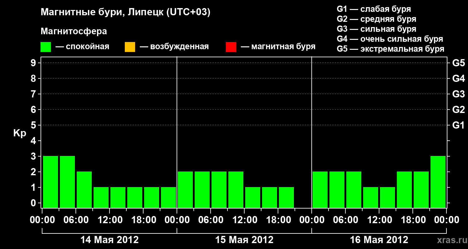 Изменения геомагнитного индекса Kp с 14 по 16 мая 2012 года для средних широт