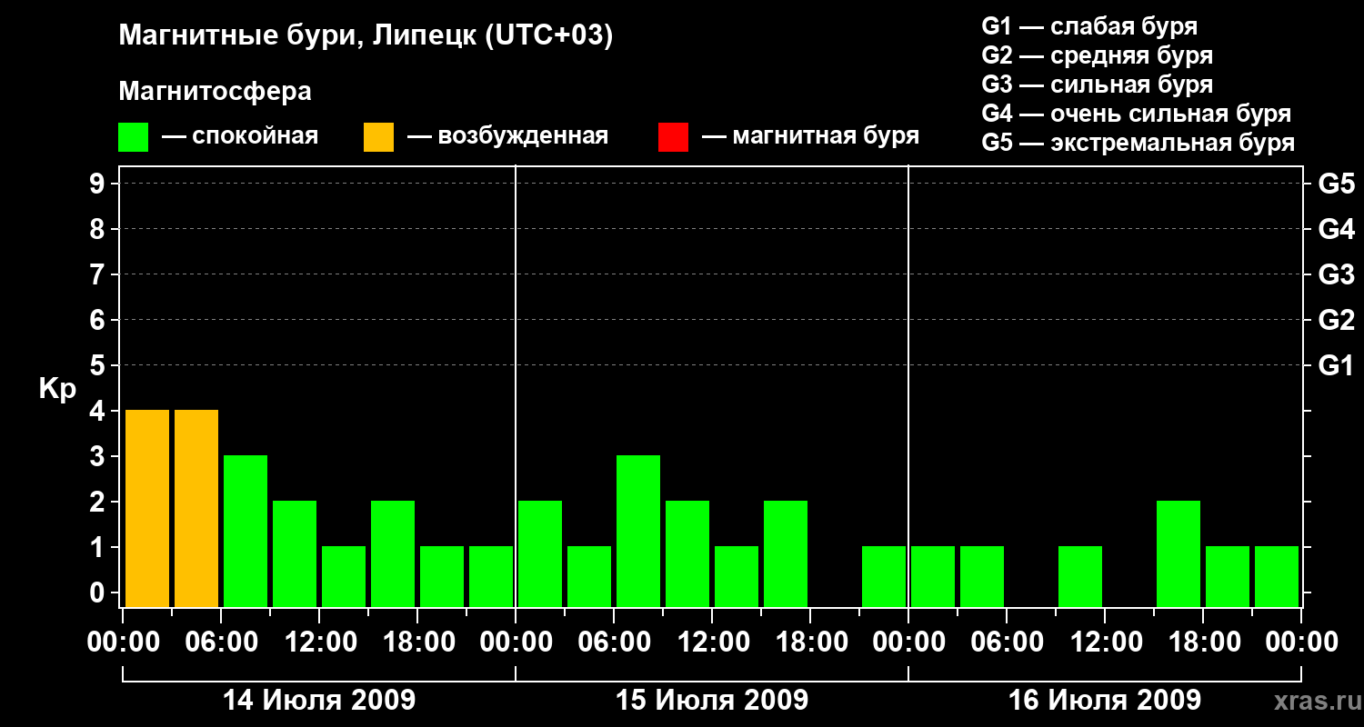 Изменения геомагнитного индекса Kp с 14 по 16 июля 2009 года для средних широт