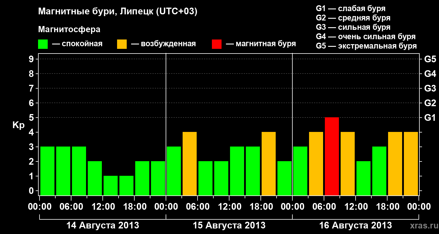 Изменения геомагнитного индекса Kp с 14 по 16 августа 2013 года для средних широт