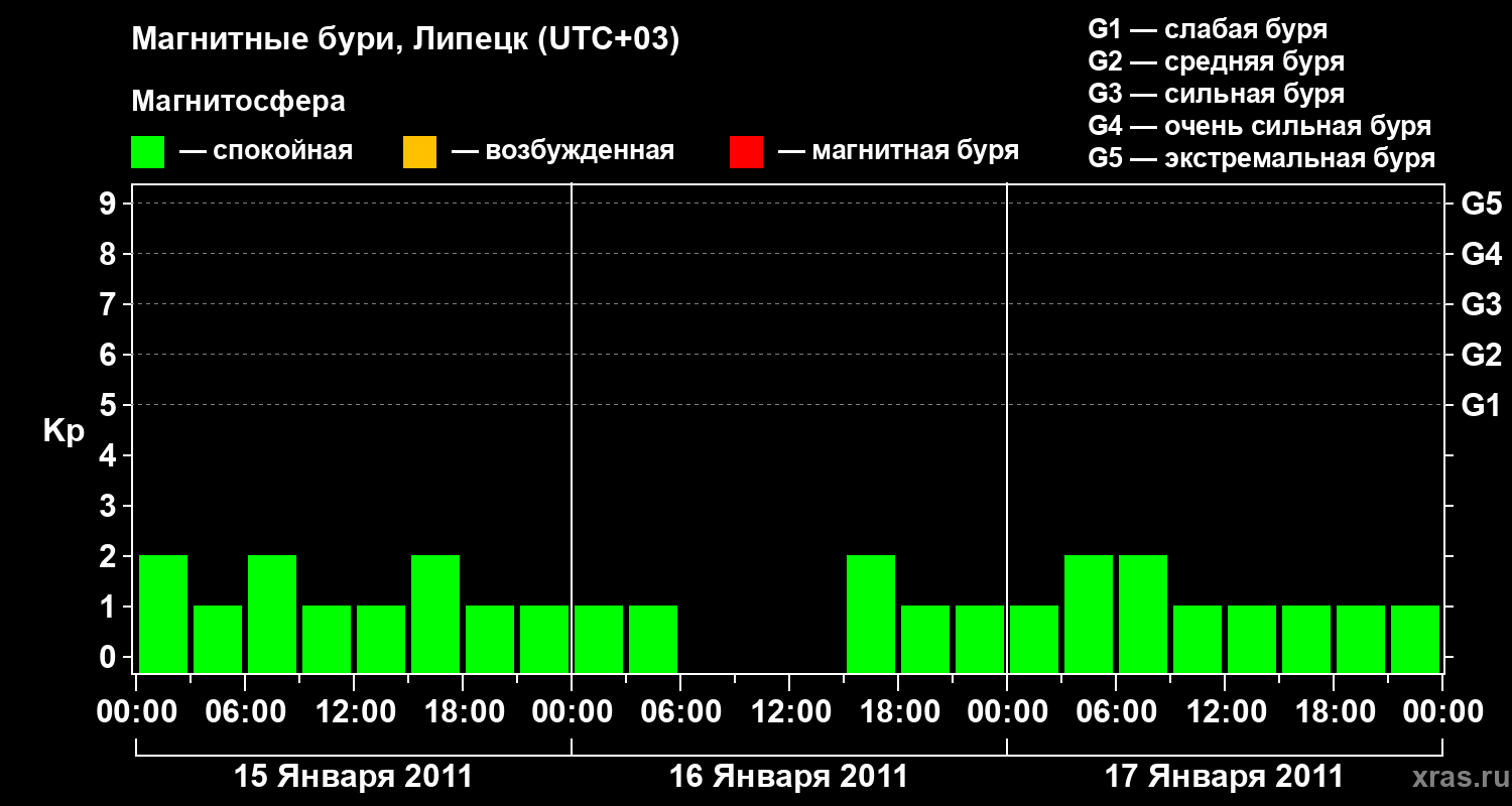 Изменения геомагнитного индекса Kp с 15 по 17 января 2011 года для средних широт