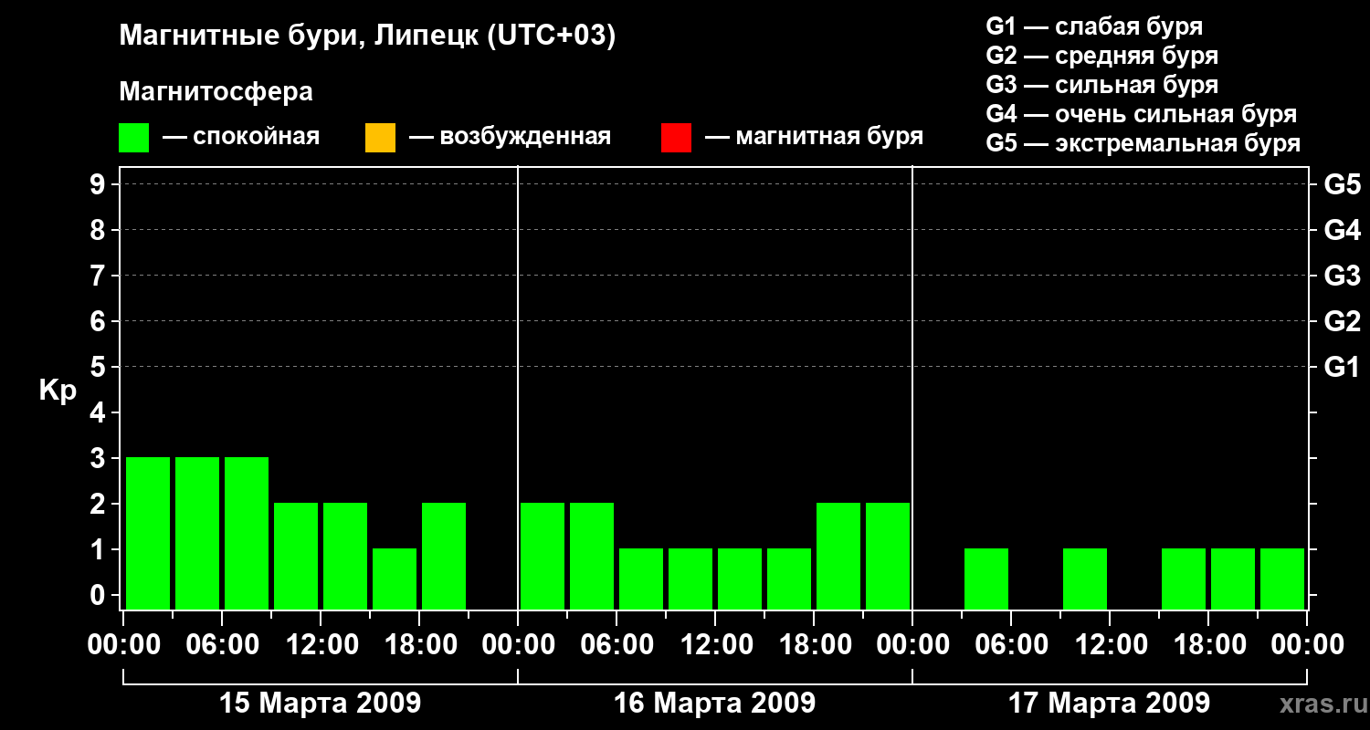Изменения геомагнитного индекса Kp с 15 по 17 марта 2009 года для средних широт