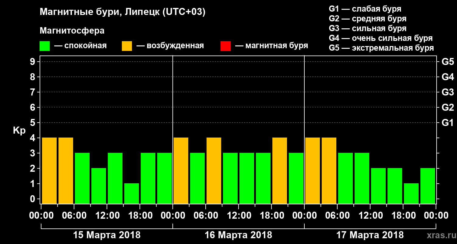 Изменения геомагнитного индекса Kp с 15 по 17 марта 2018 года для средних широт