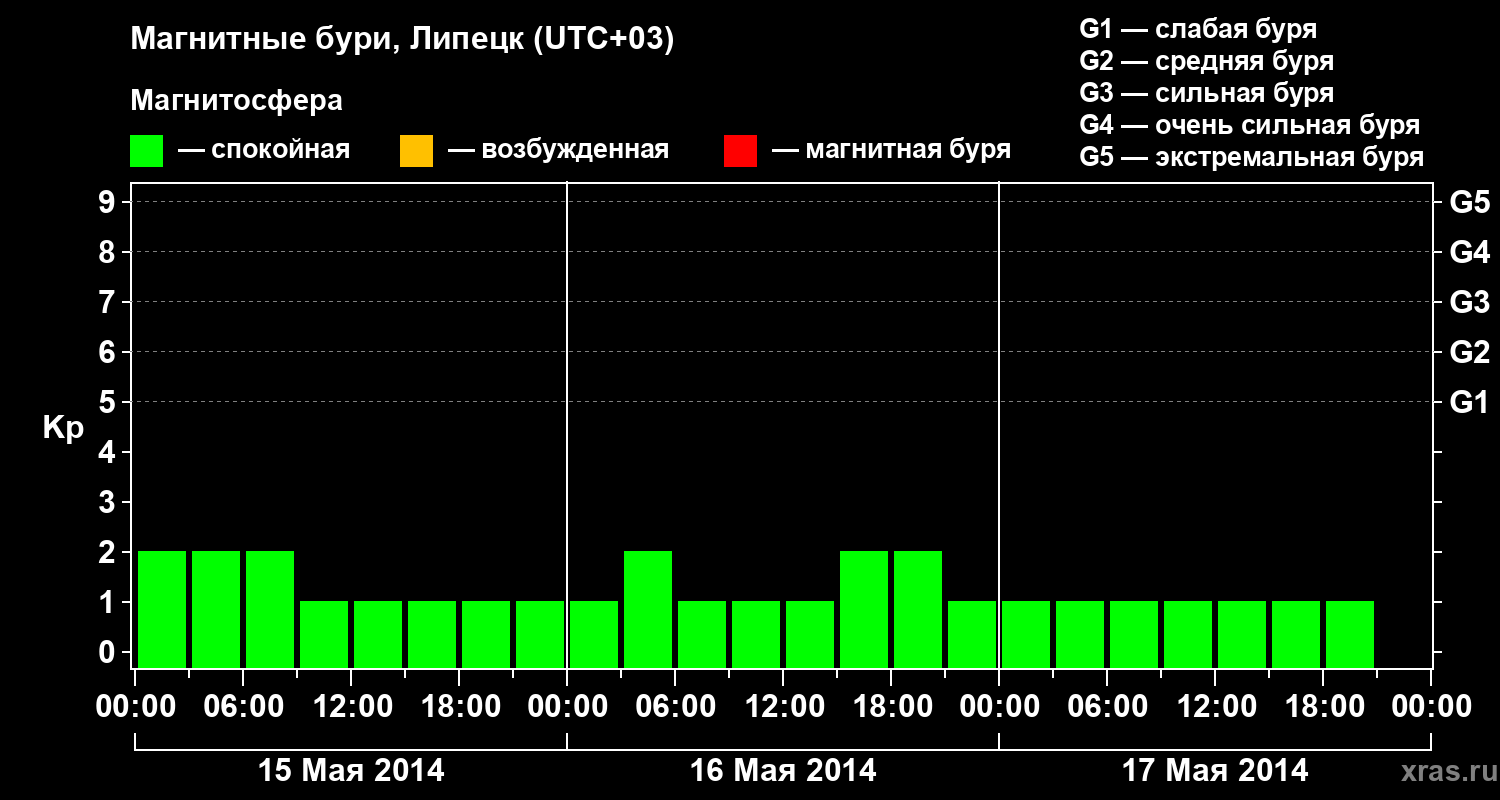 Изменения геомагнитного индекса Kp с 15 по 17 мая 2014 года для средних широт