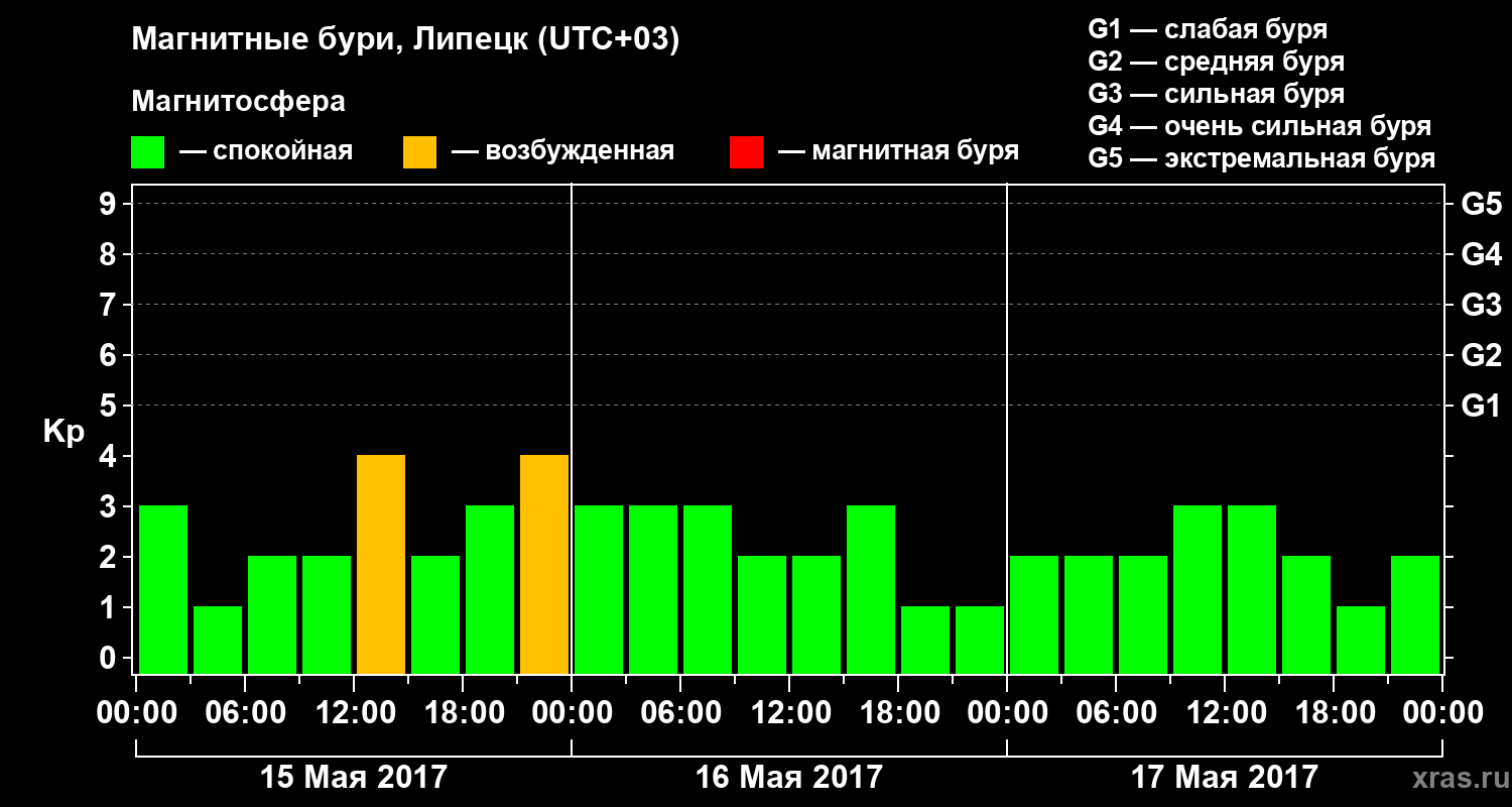 Изменения геомагнитного индекса Kp с 15 по 17 мая 2017 года для средних широт
