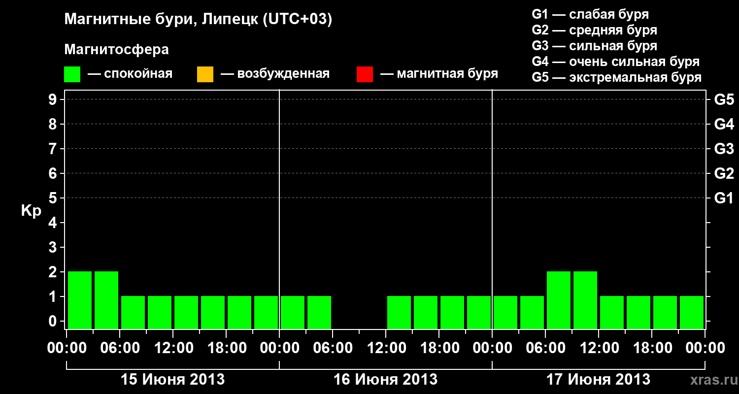 Изменения геомагнитного индекса Kp с 15 по 17 июня 2013 года для средних широт