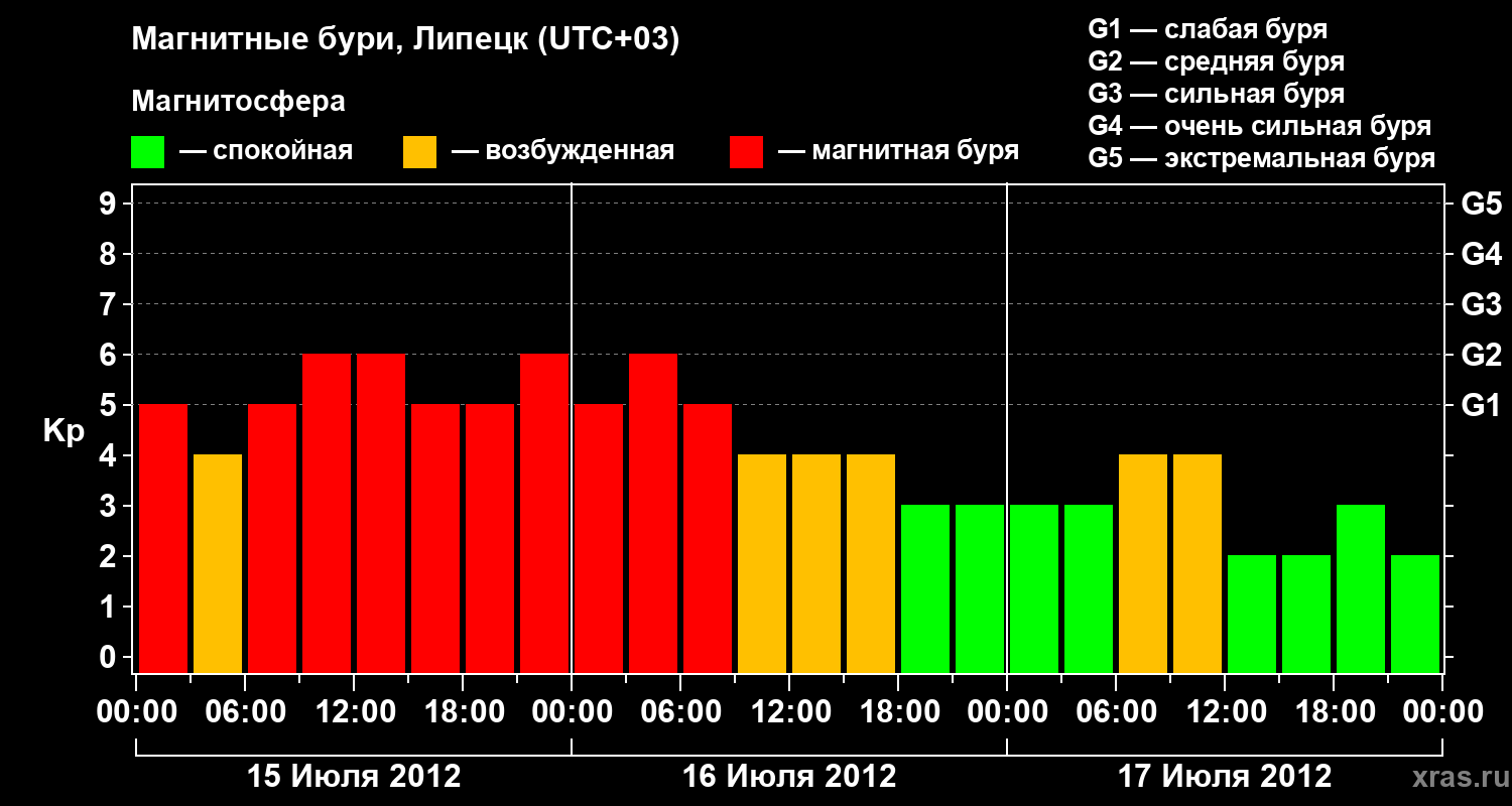 Изменения геомагнитного индекса Kp с 15 по 17 июля 2012 года для средних широт