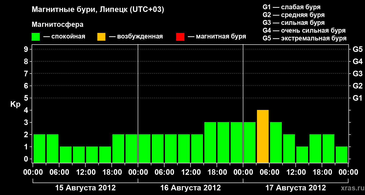 Изменения геомагнитного индекса Kp с 15 по 17 августа 2012 года для средних широт