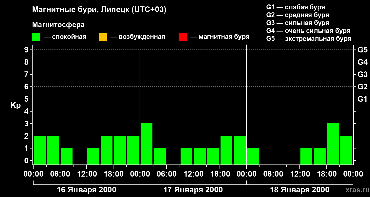 Изменения геомагнитного индекса Kp с 16 по 18 января 2000 года для средних широт