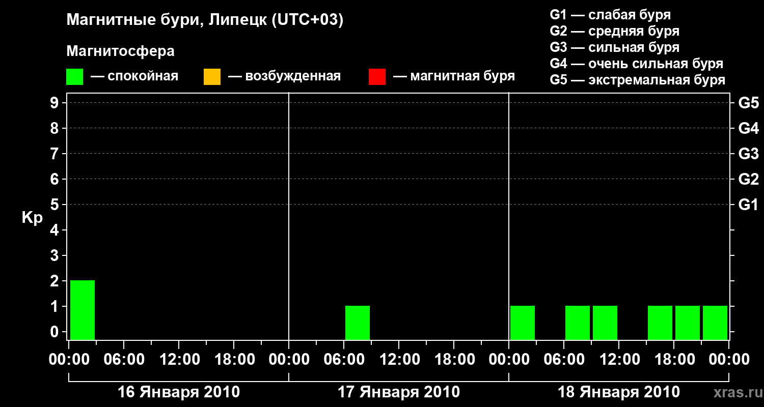 Изменения геомагнитного индекса Kp с 16 по 18 января 2010 года для средних широт