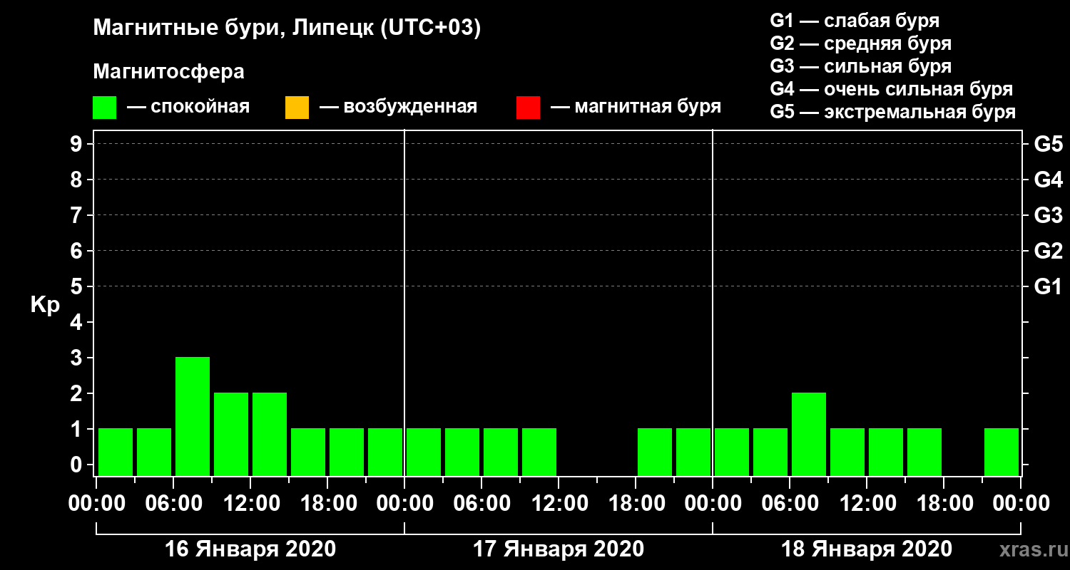 Изменения геомагнитного индекса Kp с 16 по 18 января 2020 года для средних широт