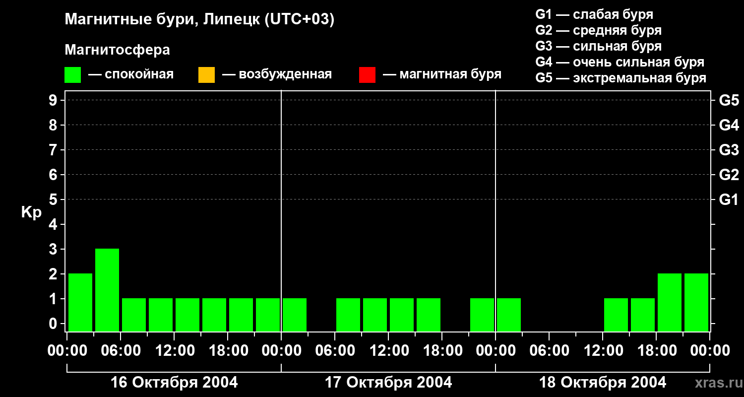 Изменения геомагнитного индекса Kp с 16 по 18 октября 2004 года для средних широт