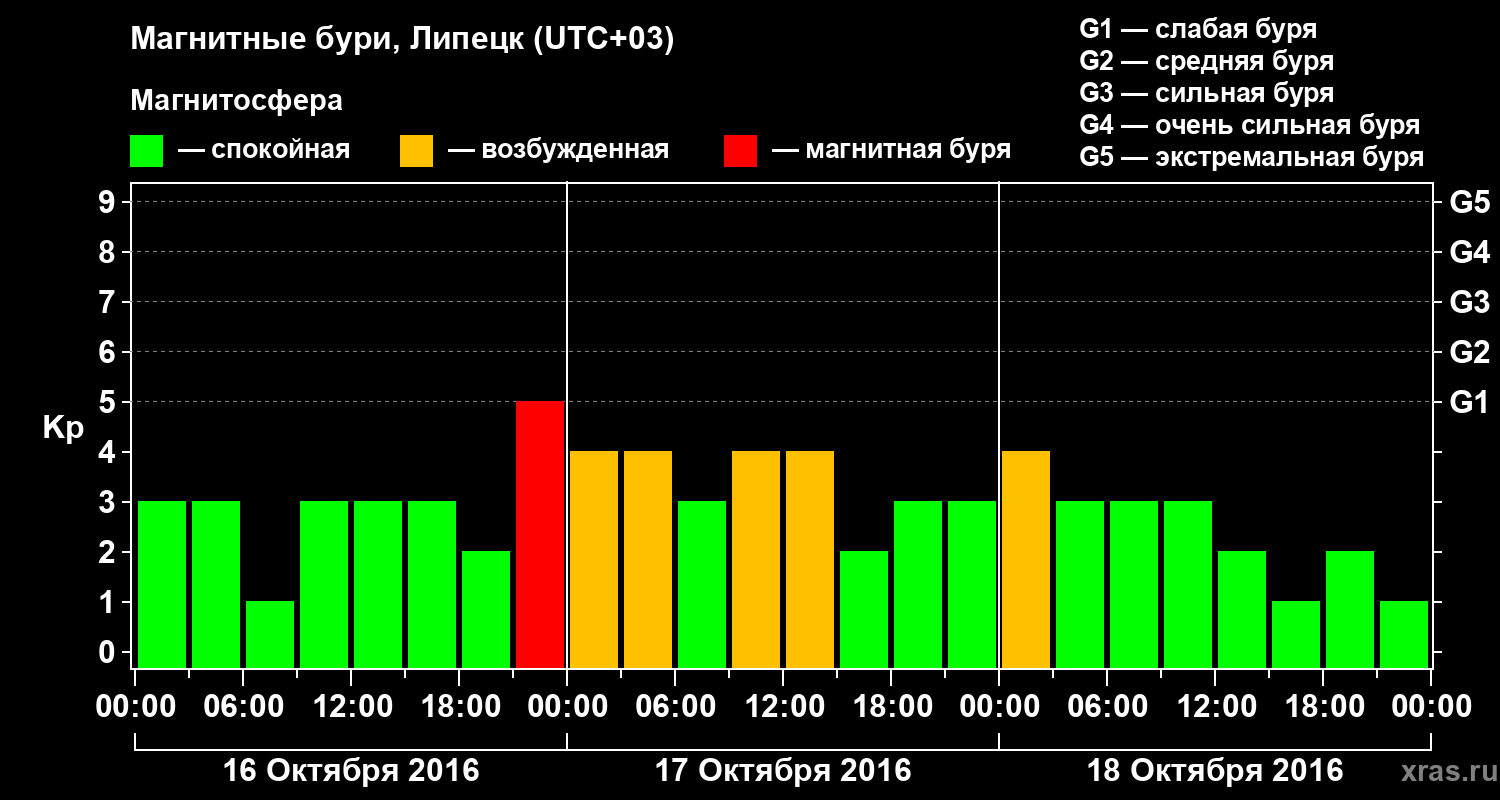 Изменения геомагнитного индекса Kp с 16 по 18 октября 2016 года для средних широт