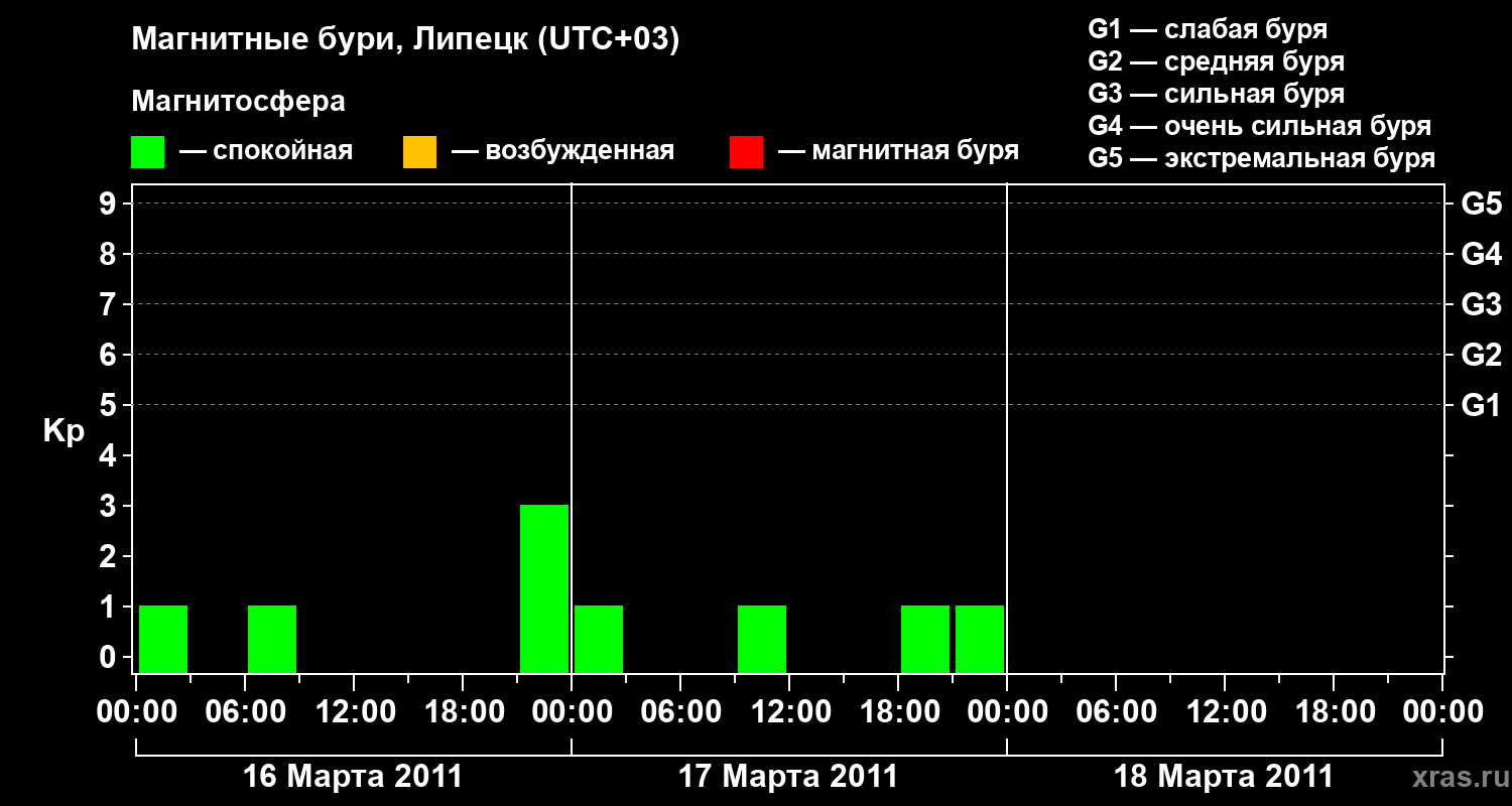 Изменения геомагнитного индекса Kp с 16 по 18 марта 2011 года для средних широт