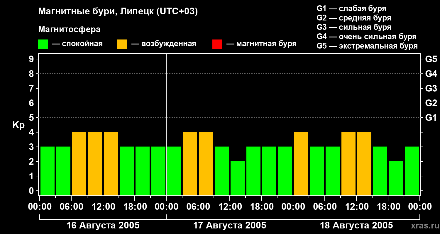 Изменения геомагнитного индекса Kp с 16 по 18 августа 2005 года для средних широт