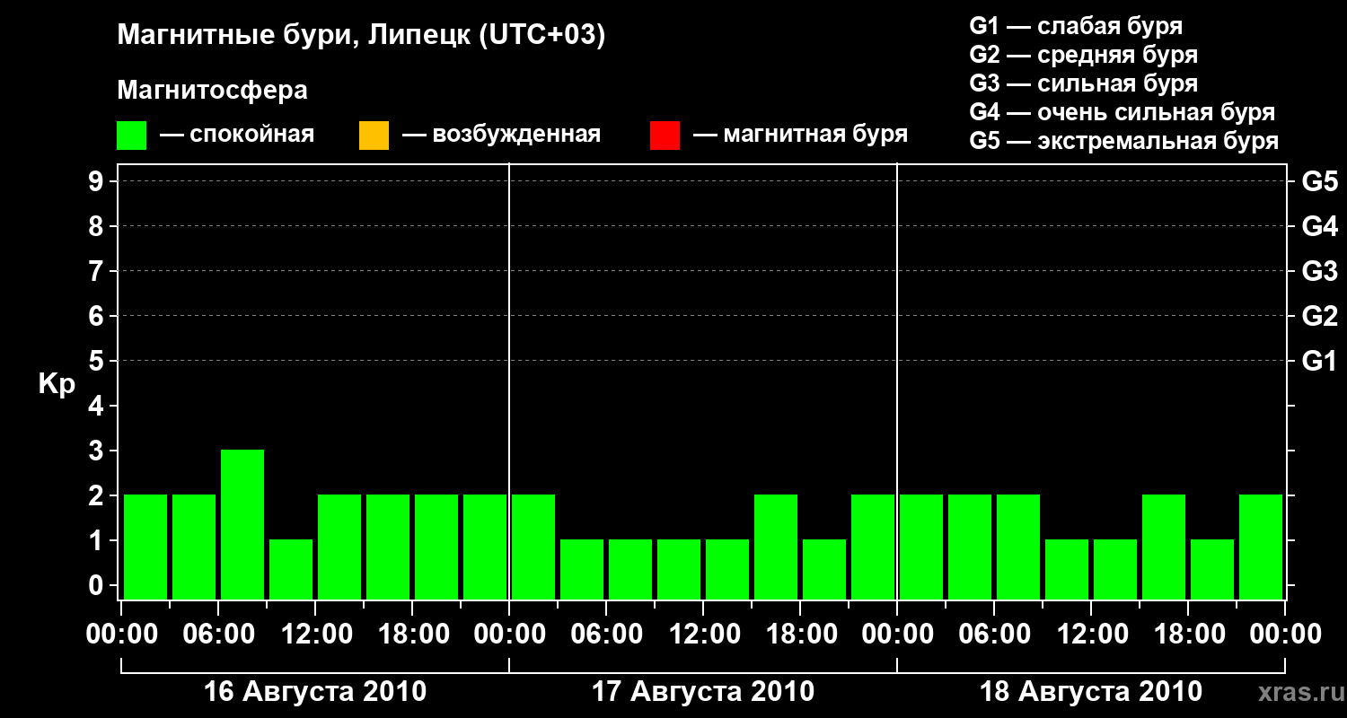Изменения геомагнитного индекса Kp с 16 по 18 августа 2010 года для средних широт
