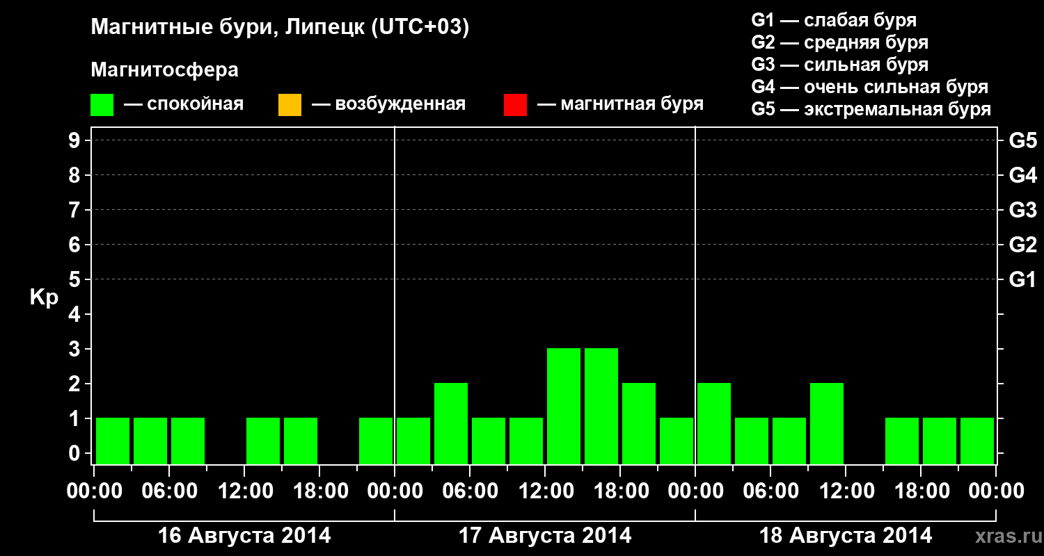 Изменения геомагнитного индекса Kp с 16 по 18 августа 2014 года для средних широт