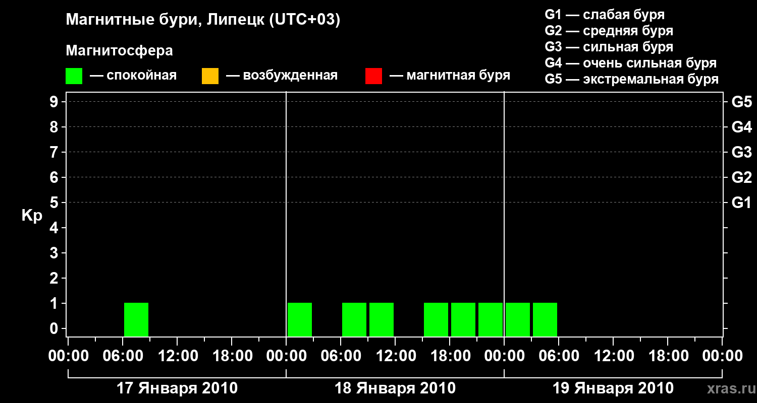 Изменения геомагнитного индекса Kp с 17 по 19 января 2010 года для средних широт